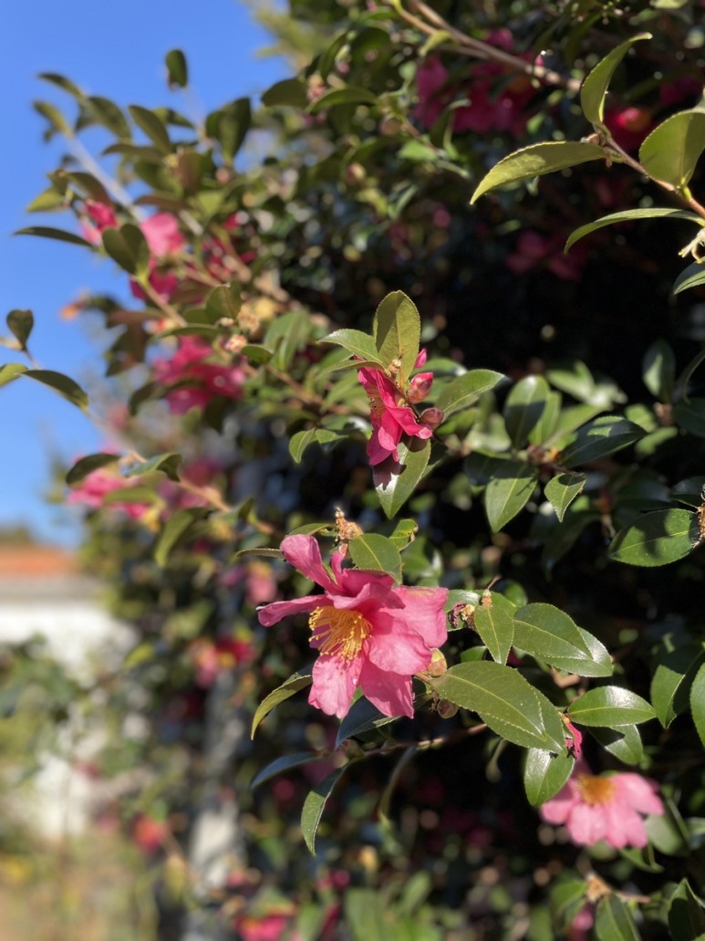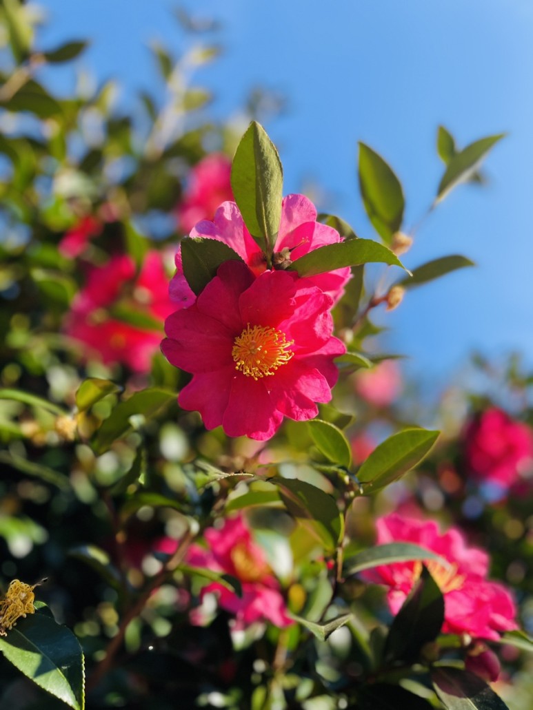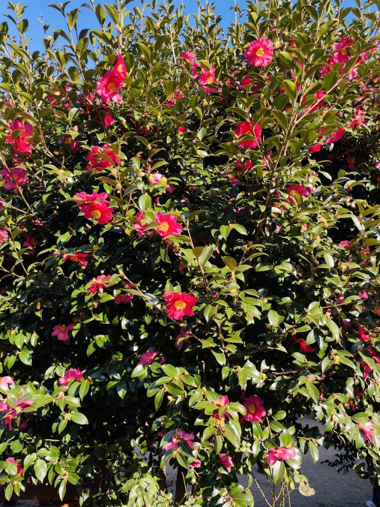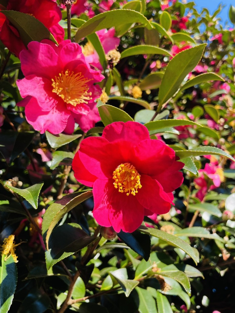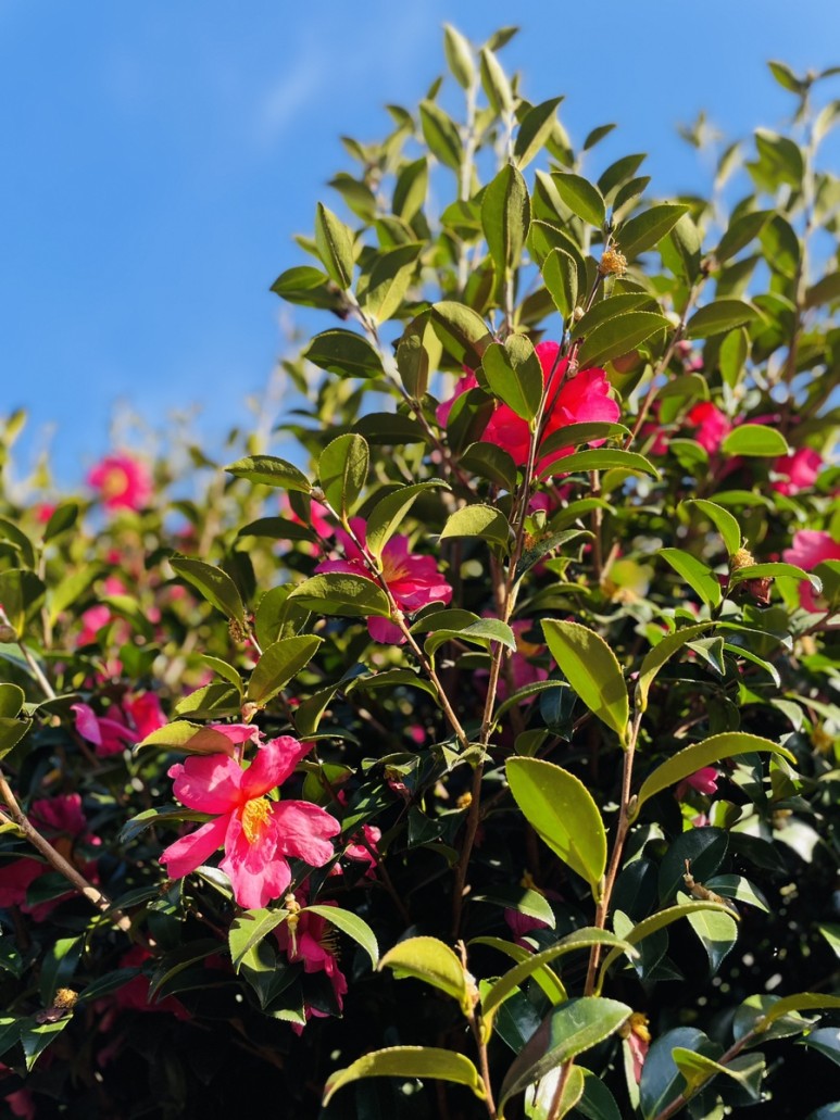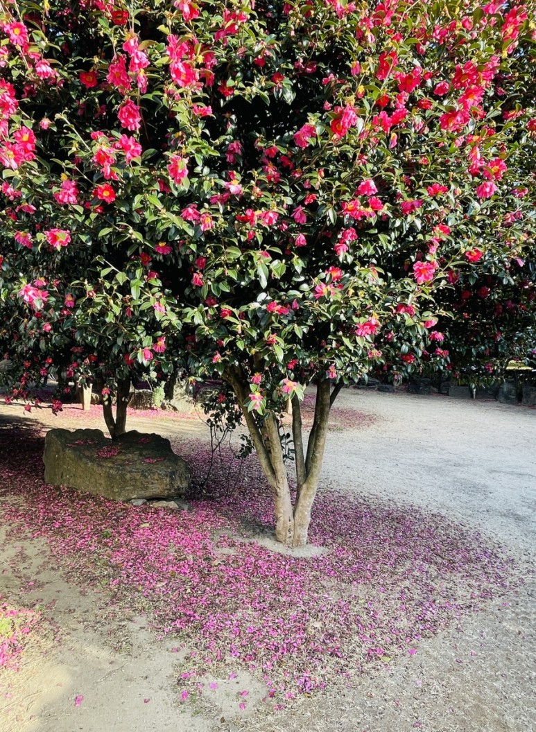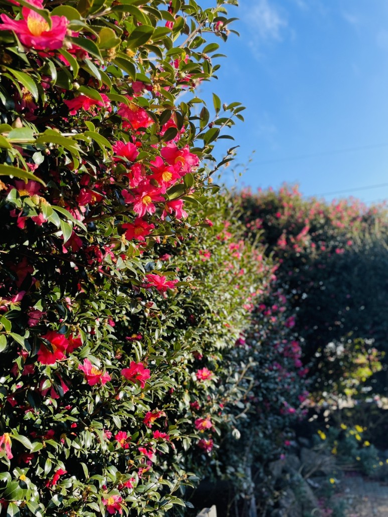 붉은 동백꽃이 만발한 동백나무, 멀리서 보아도 가까이서 보아도 아름다움으로 가득합니다.