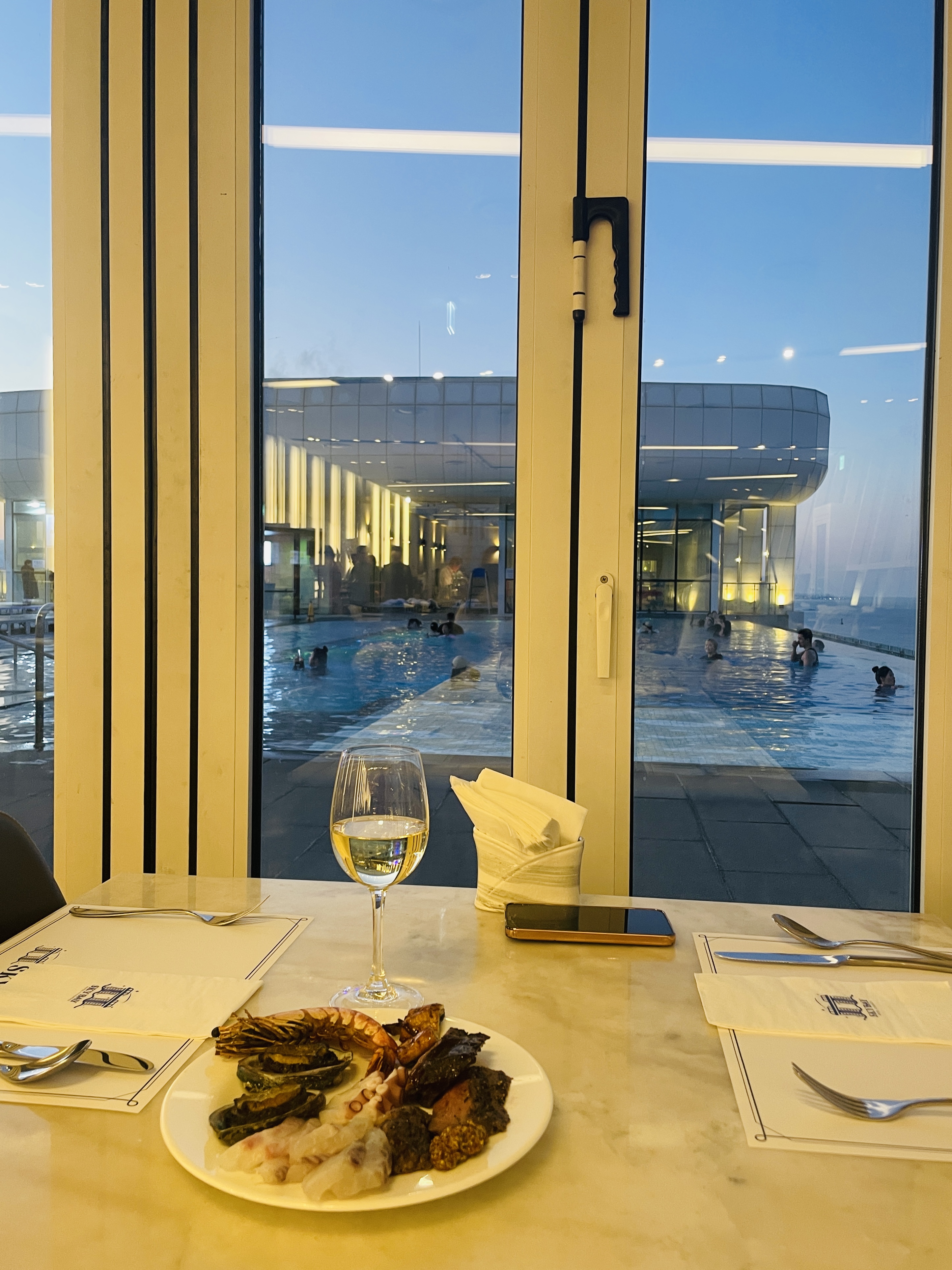 뷔페 입구에서부터 고급스러운 분위기가 느껴져요. 화이트 톤의 모던한 인테리어와 세련된 테이블 세팅이 눈길을 사로잡아요. 야외 인피니티 풀이 보이는 자리에서 식사를 하니까 마치 해외 리조트에 온 것 같은 기분을 느낄 수 있어요.