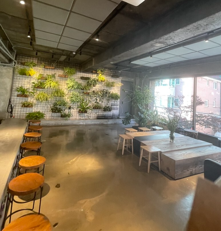 벽이나 실내 공간에 초록색 식물들이 장식되어 있어 삭막한 도심 속에서 힐링할 수 있는 장소로 연출되었습니다.