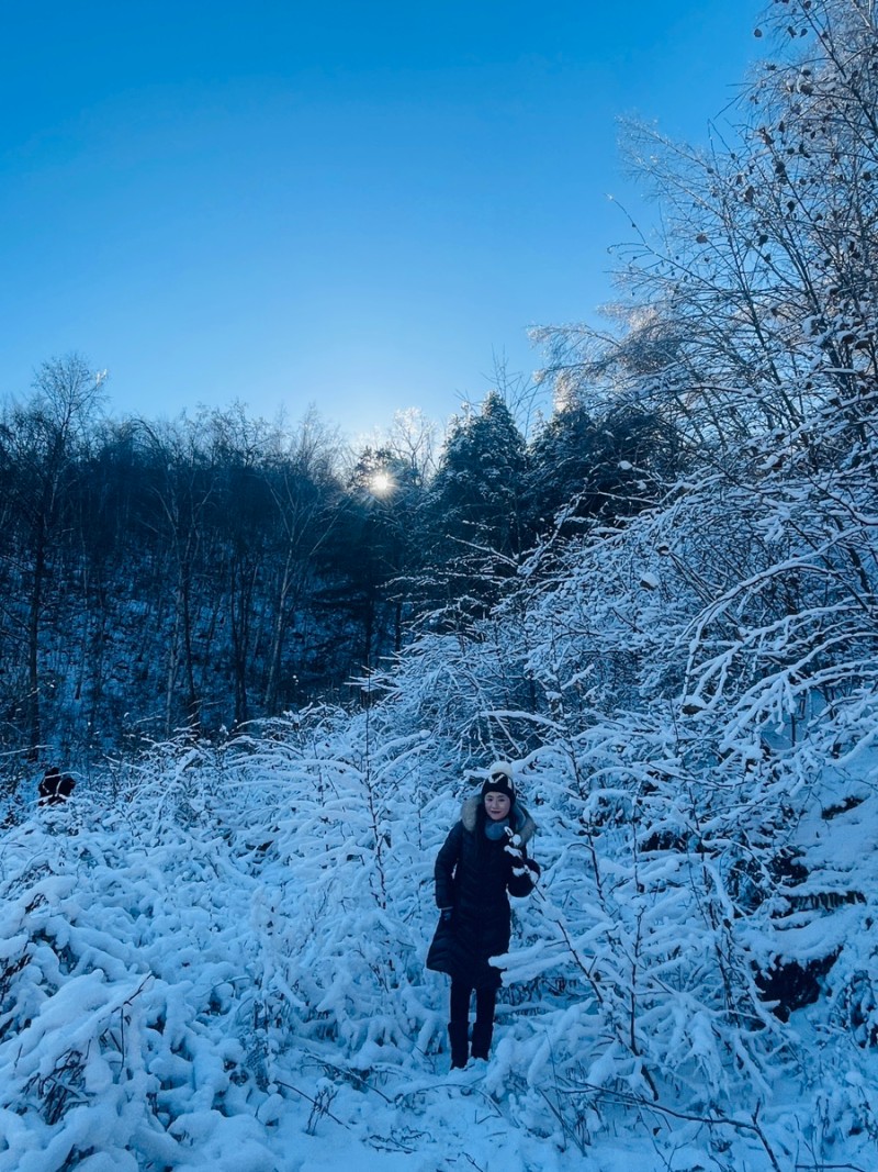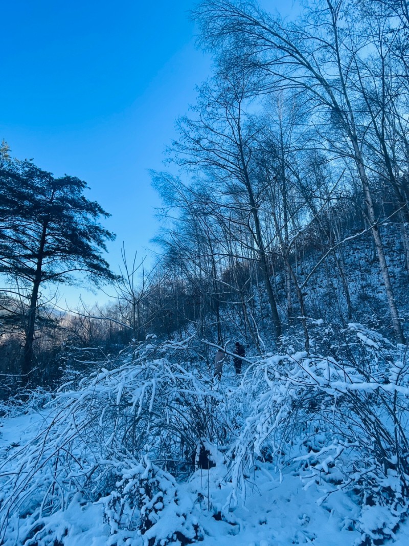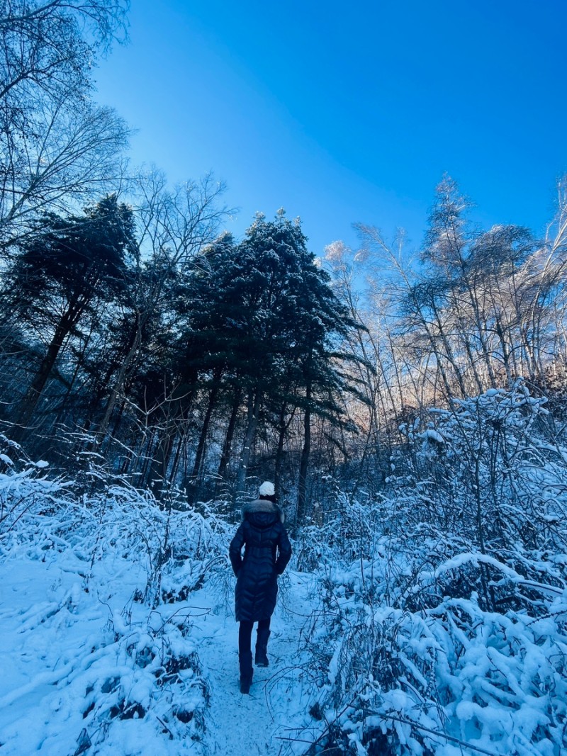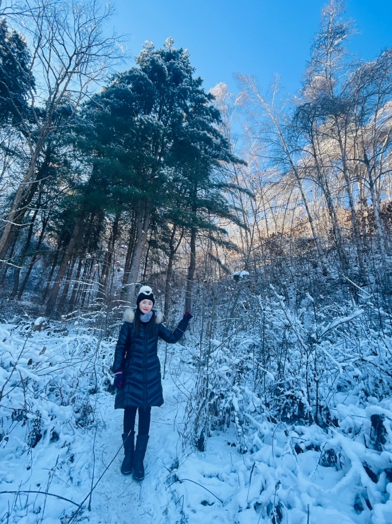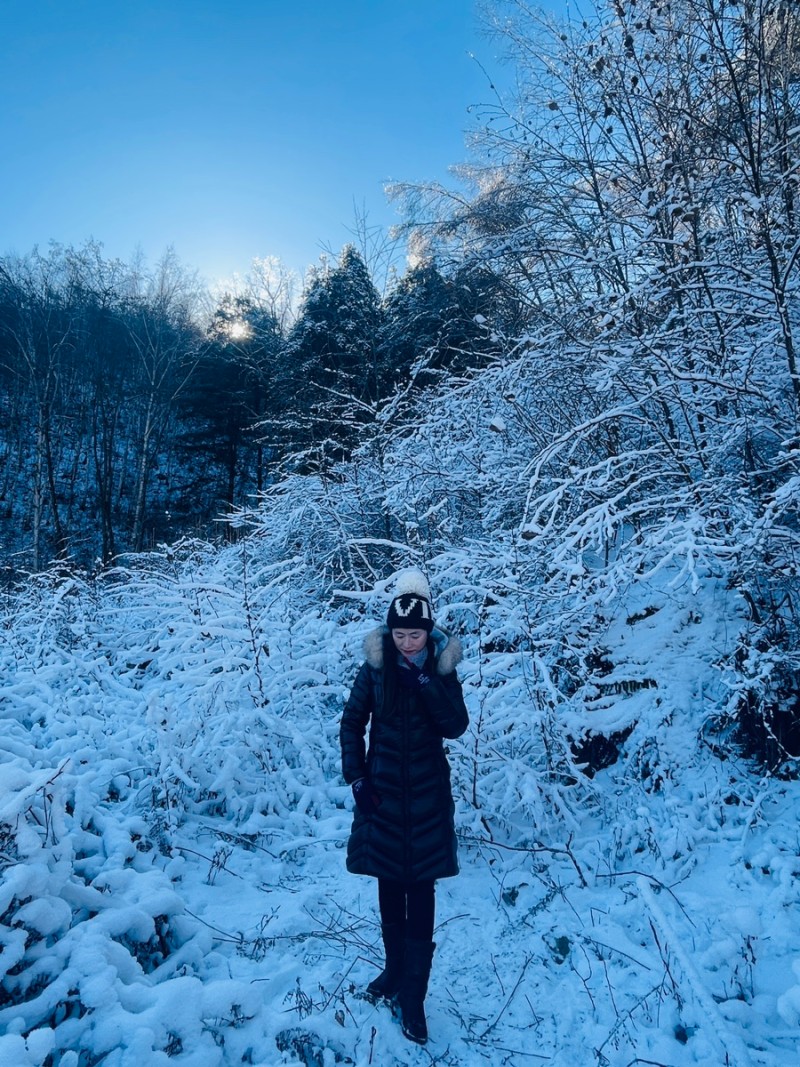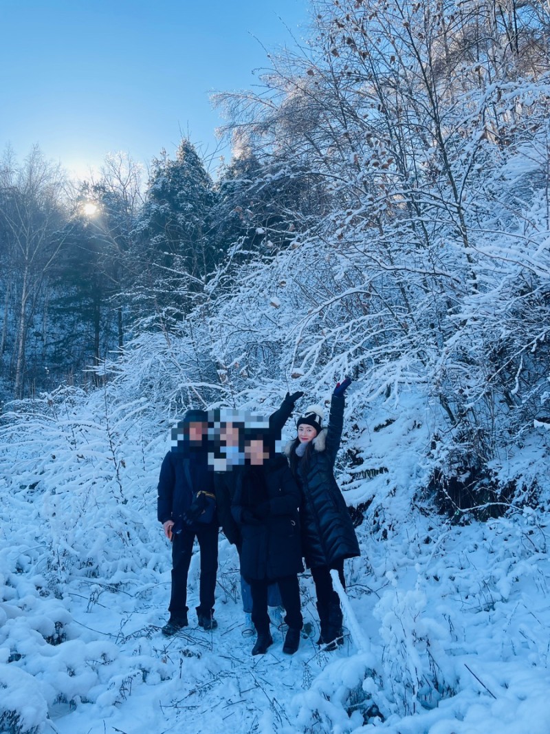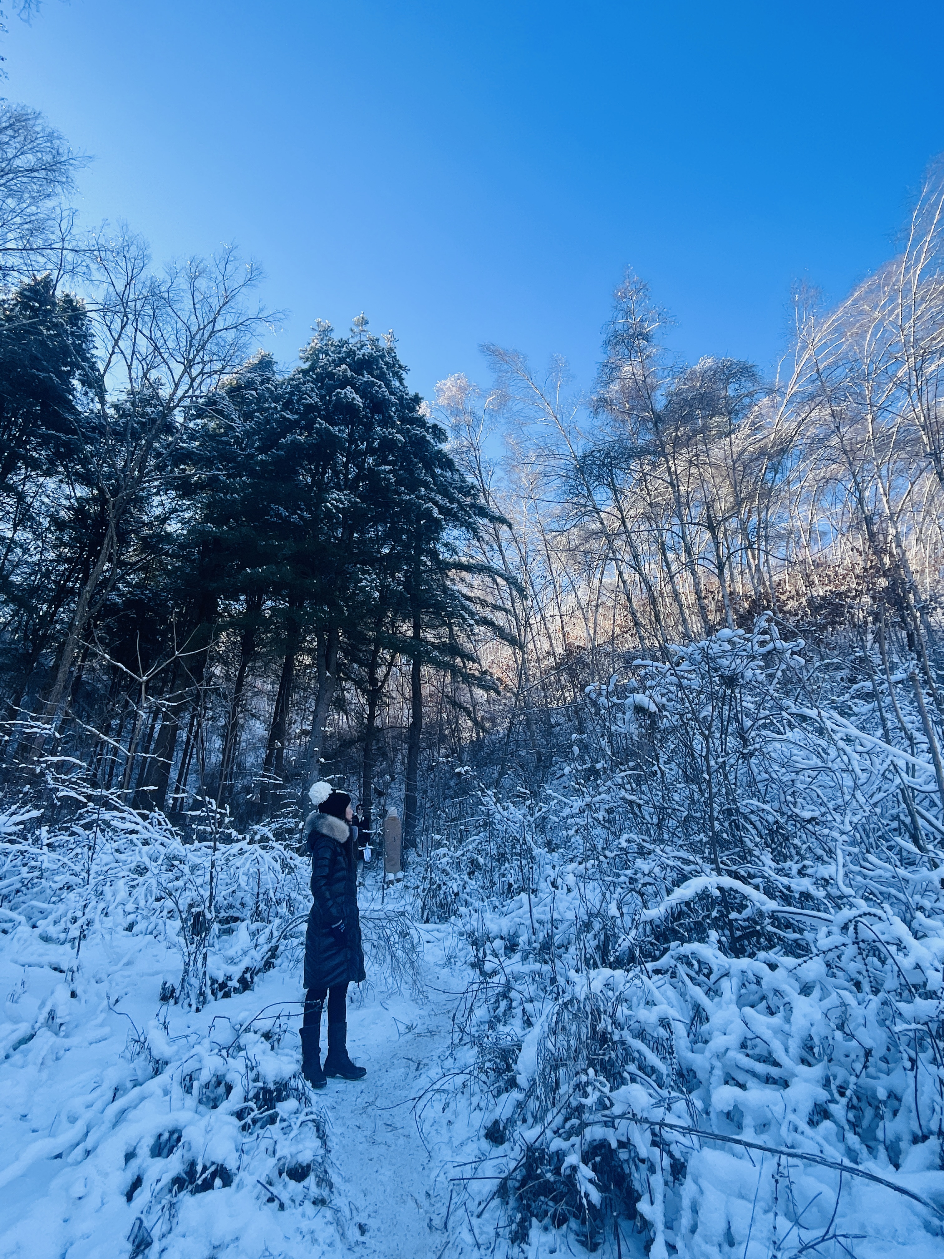 숲속에 하얀 눈이 소복히 쌓인 오솔길에서 포토 스팟을 발견했습니다. 너도 나도 찍겠다고 하는 사람들이 많아줄을 서서 가족 사진 하나 남겼습니다.
