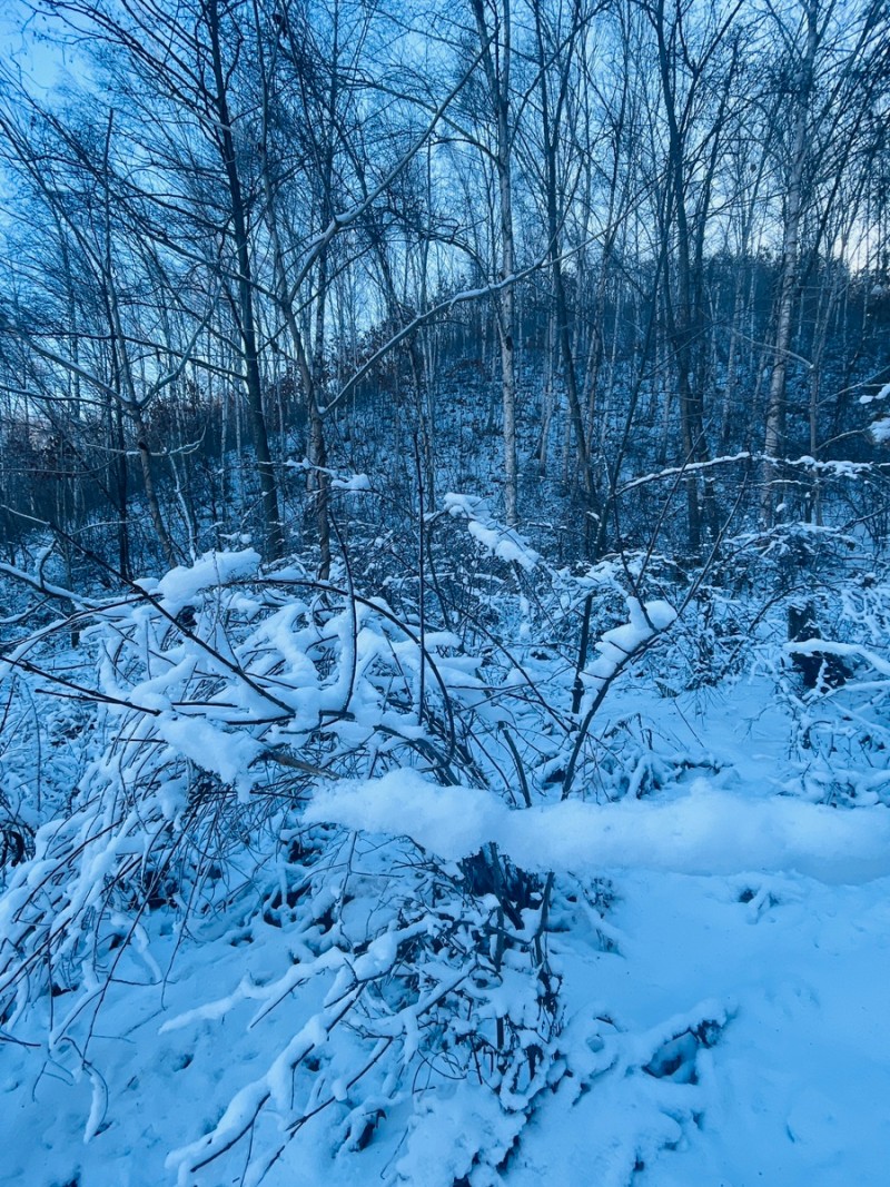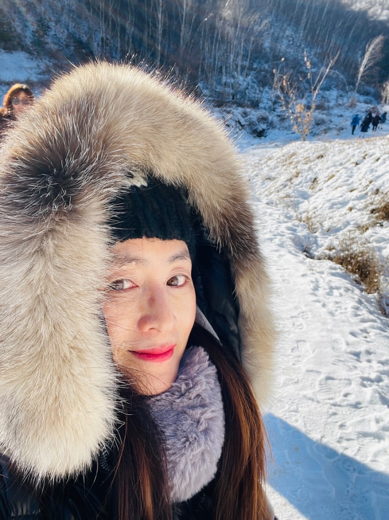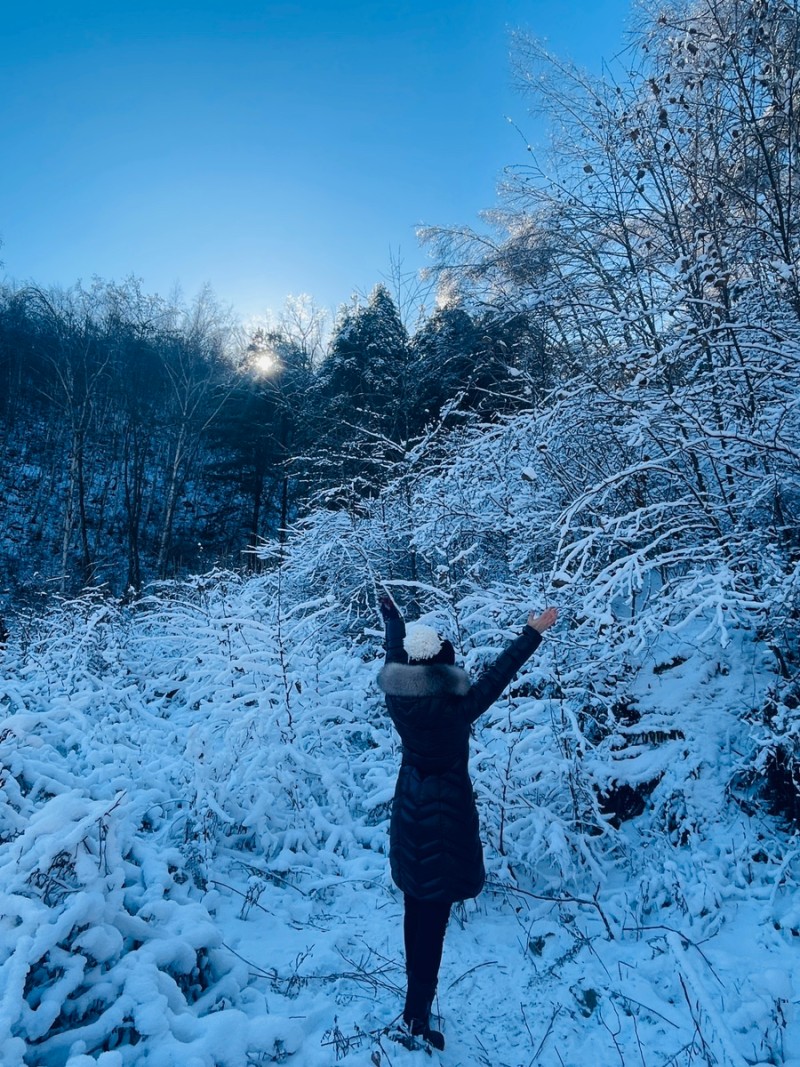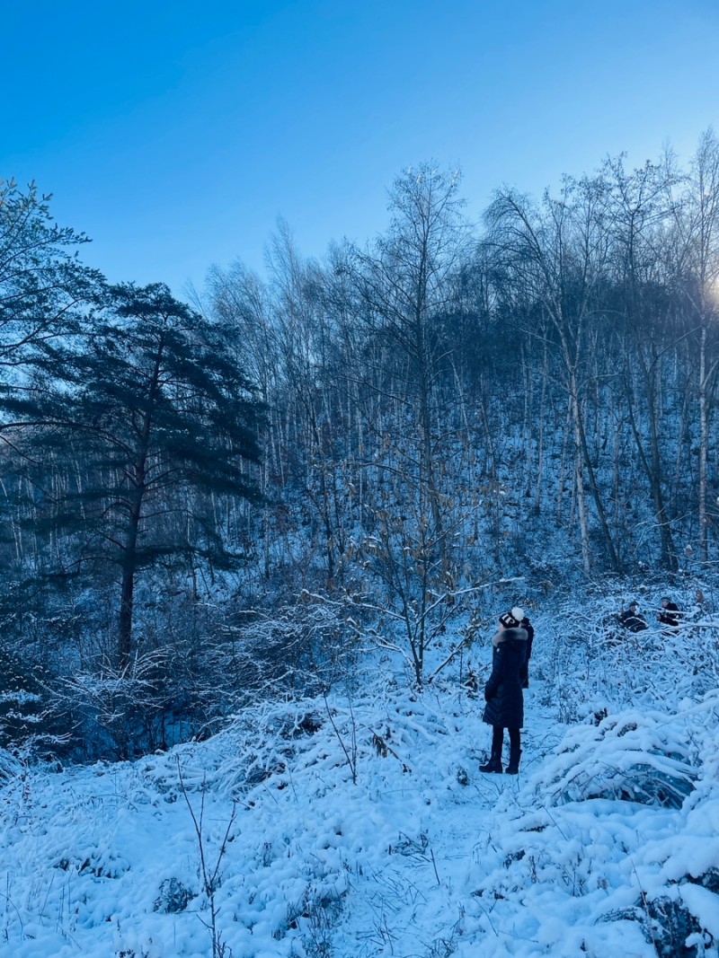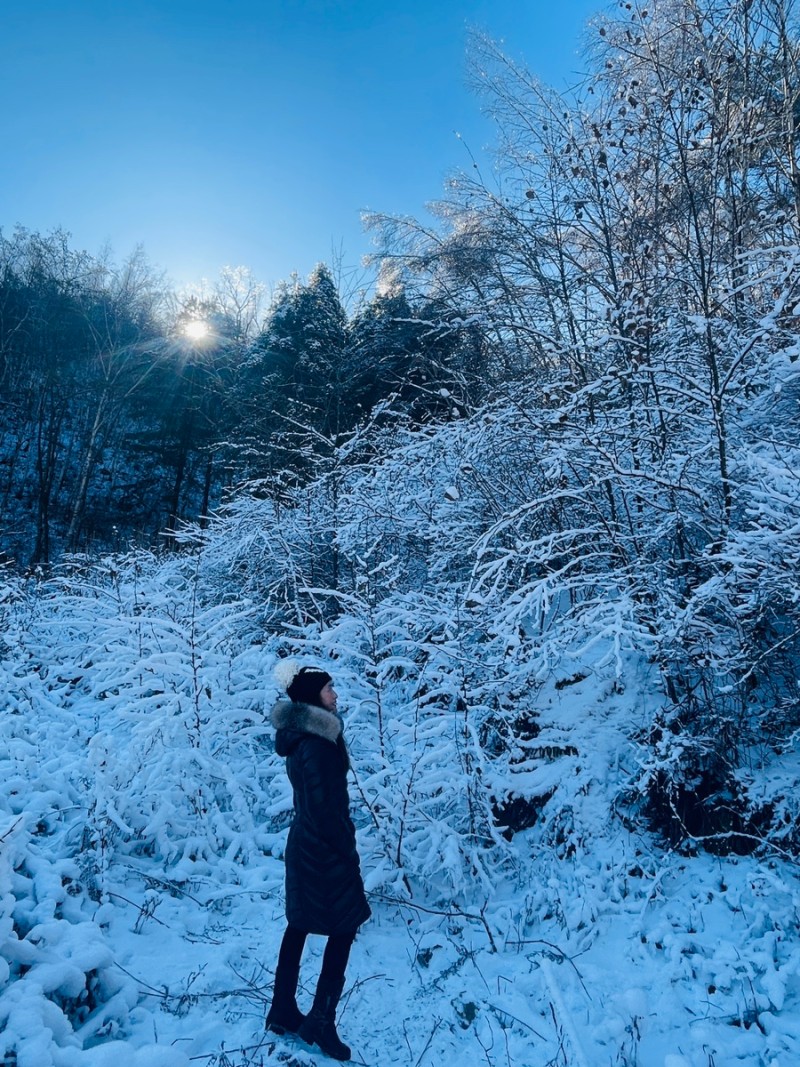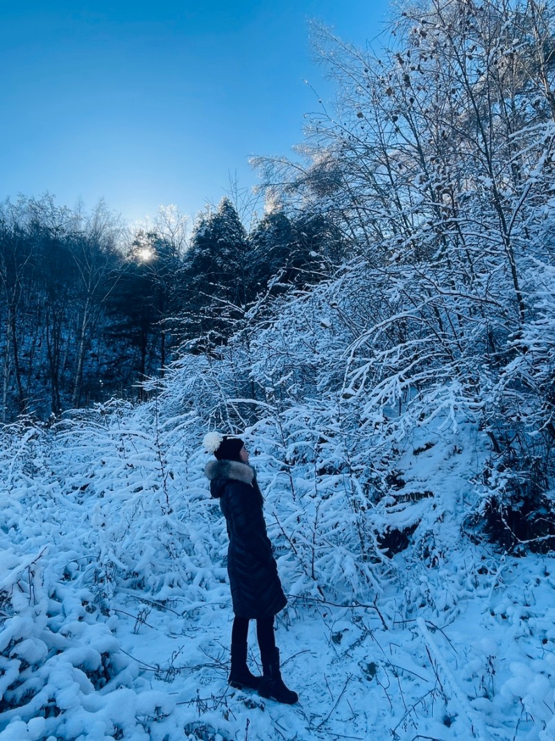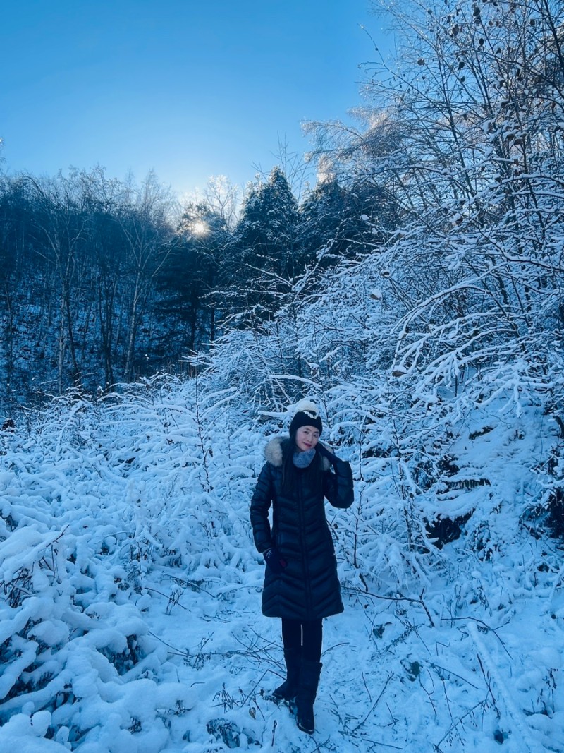 숲속에 하얀 눈이 소복히 쌓인 오솔길에서 포토 스팟을 발견했습니다. 너도 나도 찍겠다고 하는 사람들이 많아줄을 서서 가족 사진 하나 남겼습니다.