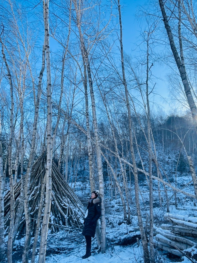 내려오다 보니 자작나무숲 사이에 멋진 나무 집이 있어 마지막으로 인증샷 남겼습니다.