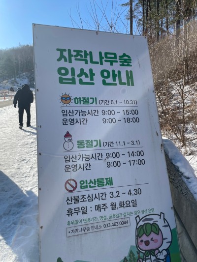 한 겨울에는 눈이 쌓인 자작나무 숲을 보기 위해 일부러 찾아 오는 곳이지만, 날씨나 상황에 따라 입산이 통제 될 수 있음을 염두에 두고 대비를 해야겠습니다.